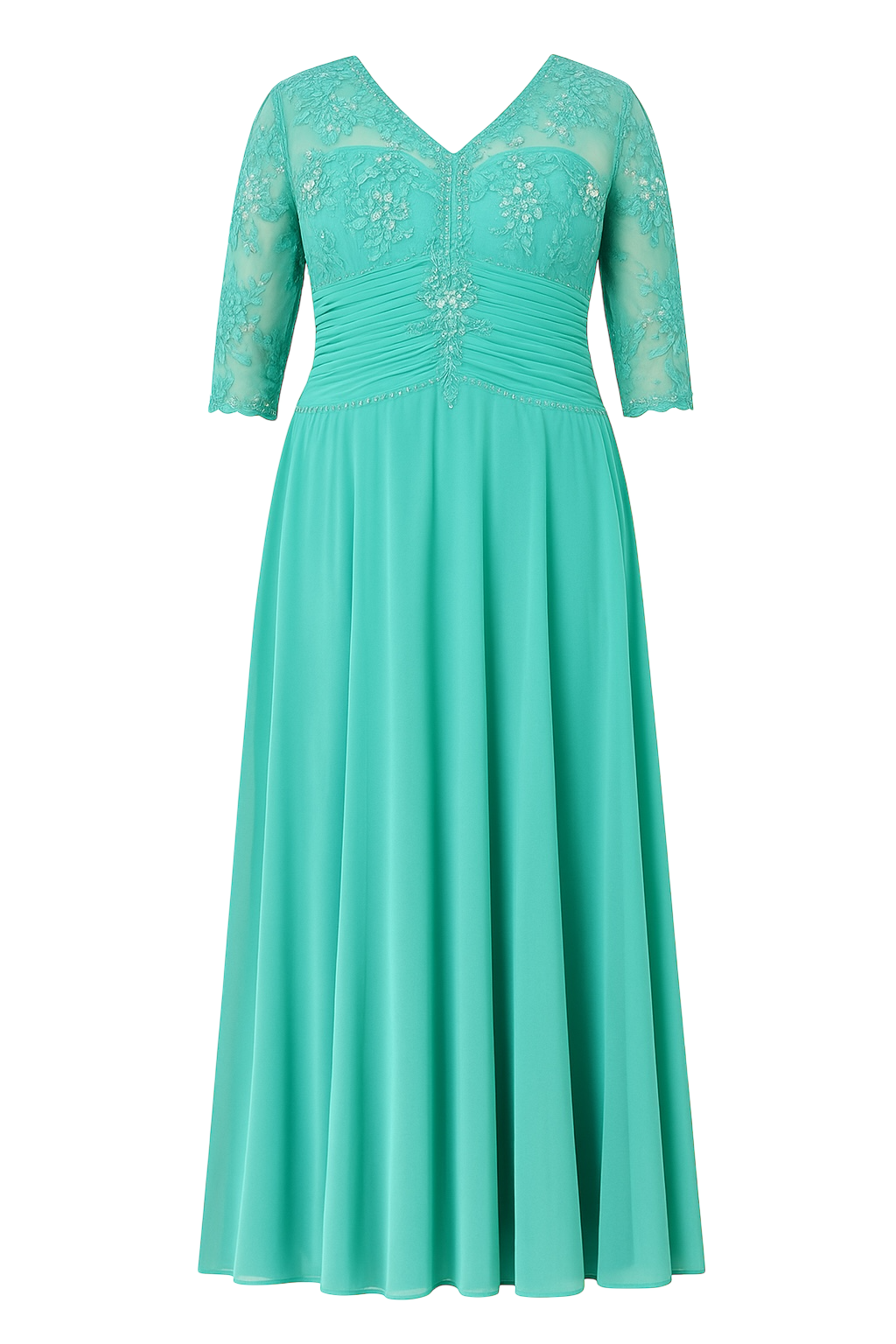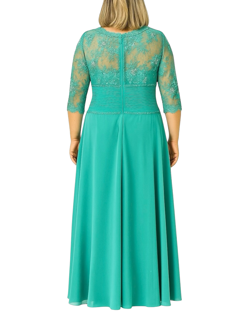 • Mangas 3/4 em renda transparente, trazendo sofisticação e leveza