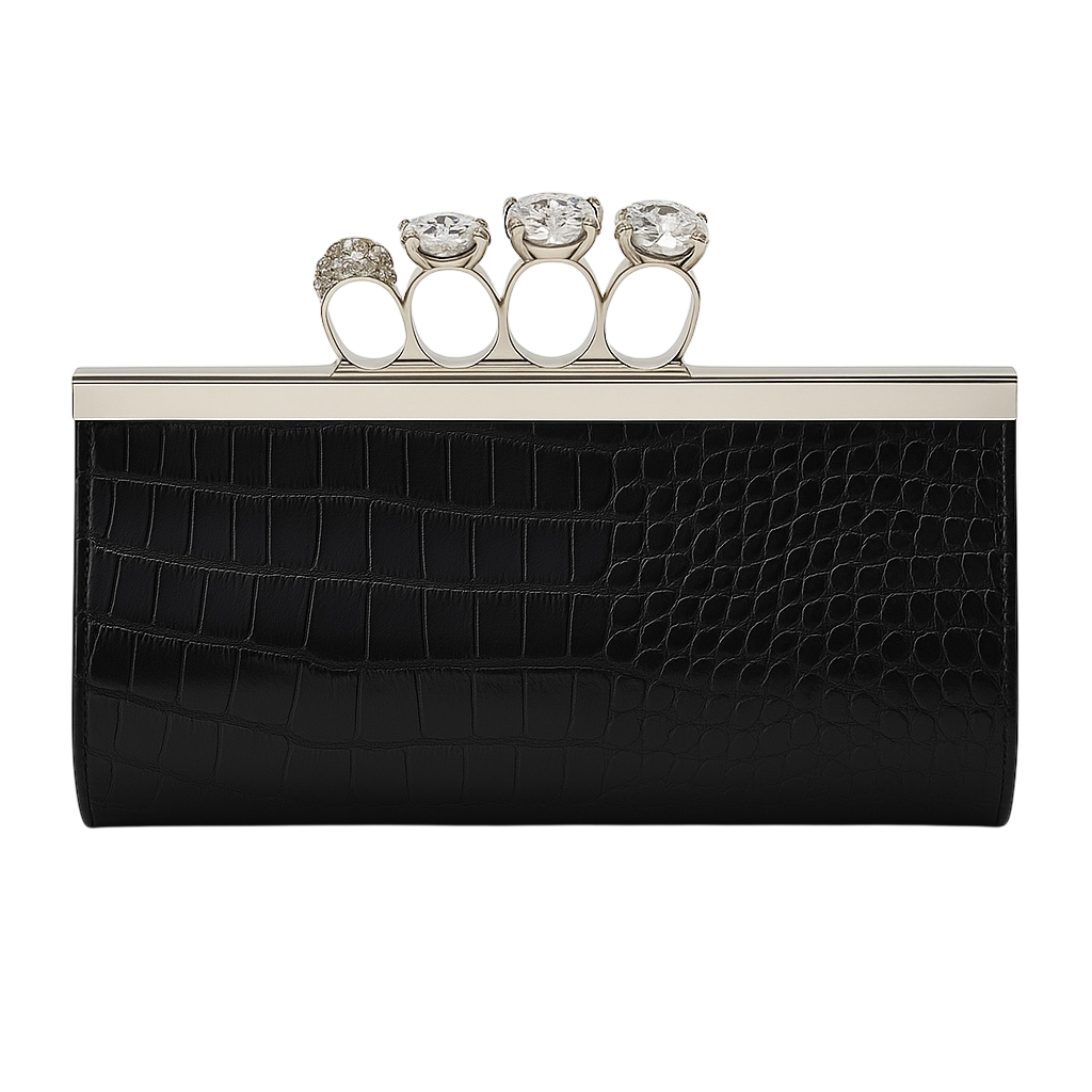 Fechamento superior em metal prateado com detalhe de knuckle rings — quatro aros com pedras grandes e facetadas que simulam anéis de joias, unindo elegância e atitude.