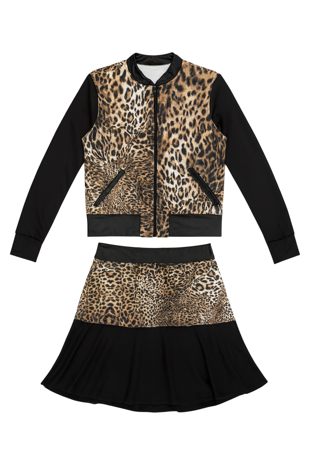 • Saia com recorte animal print na cintura, criando harmonia com a jaqueta e destacando a região da cintura