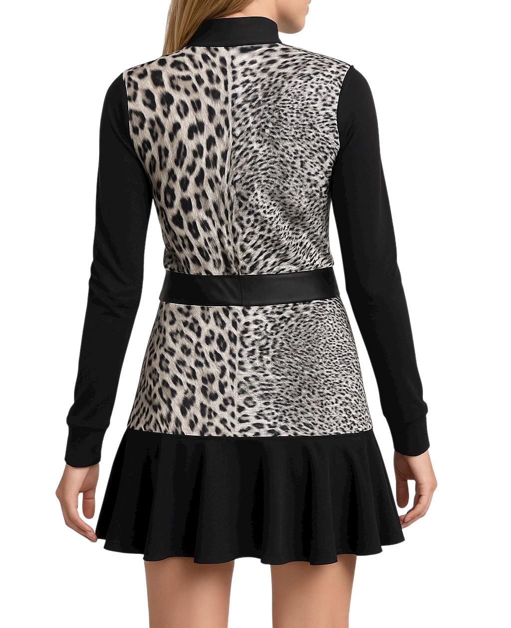 • Conjunto composto por blusa de manga longa e saia evasê, combinando estampa animal print em preto e branco com detalhes em corino preto