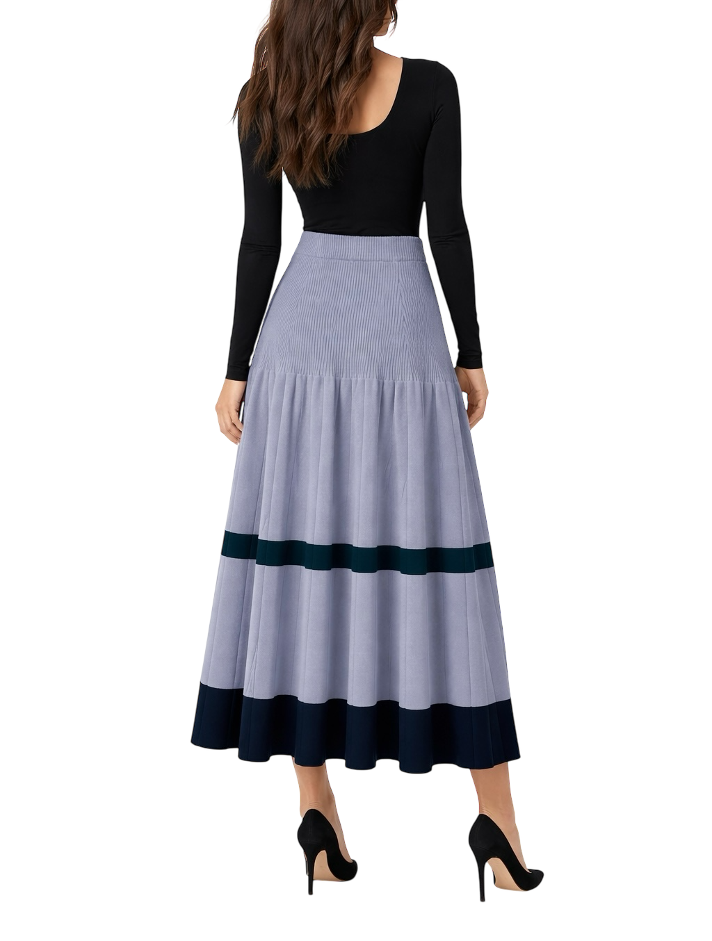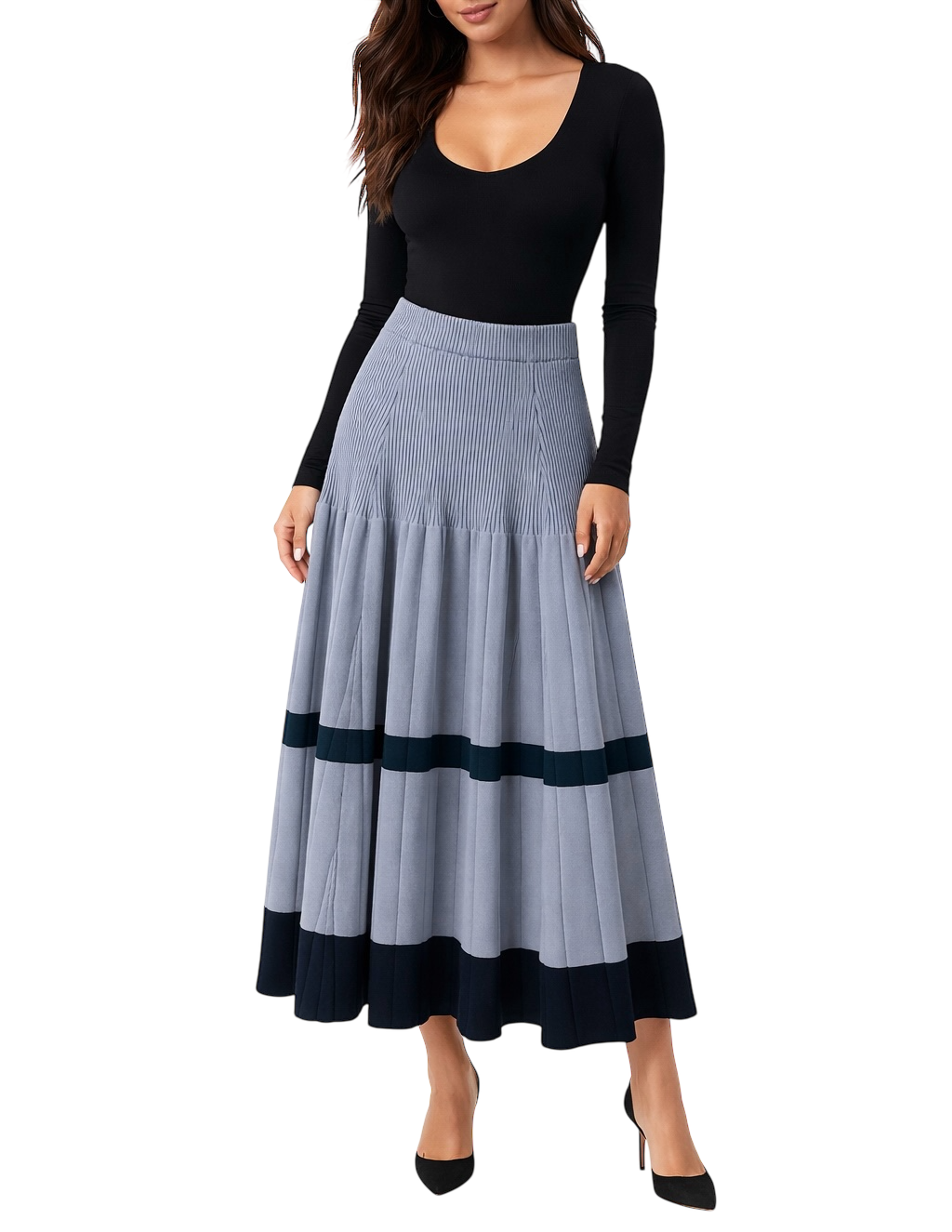 • Tricot encorpado com textura canelada na parte superior e pregas verticais no corpo da saia, oferecendo movimento e sofisticação