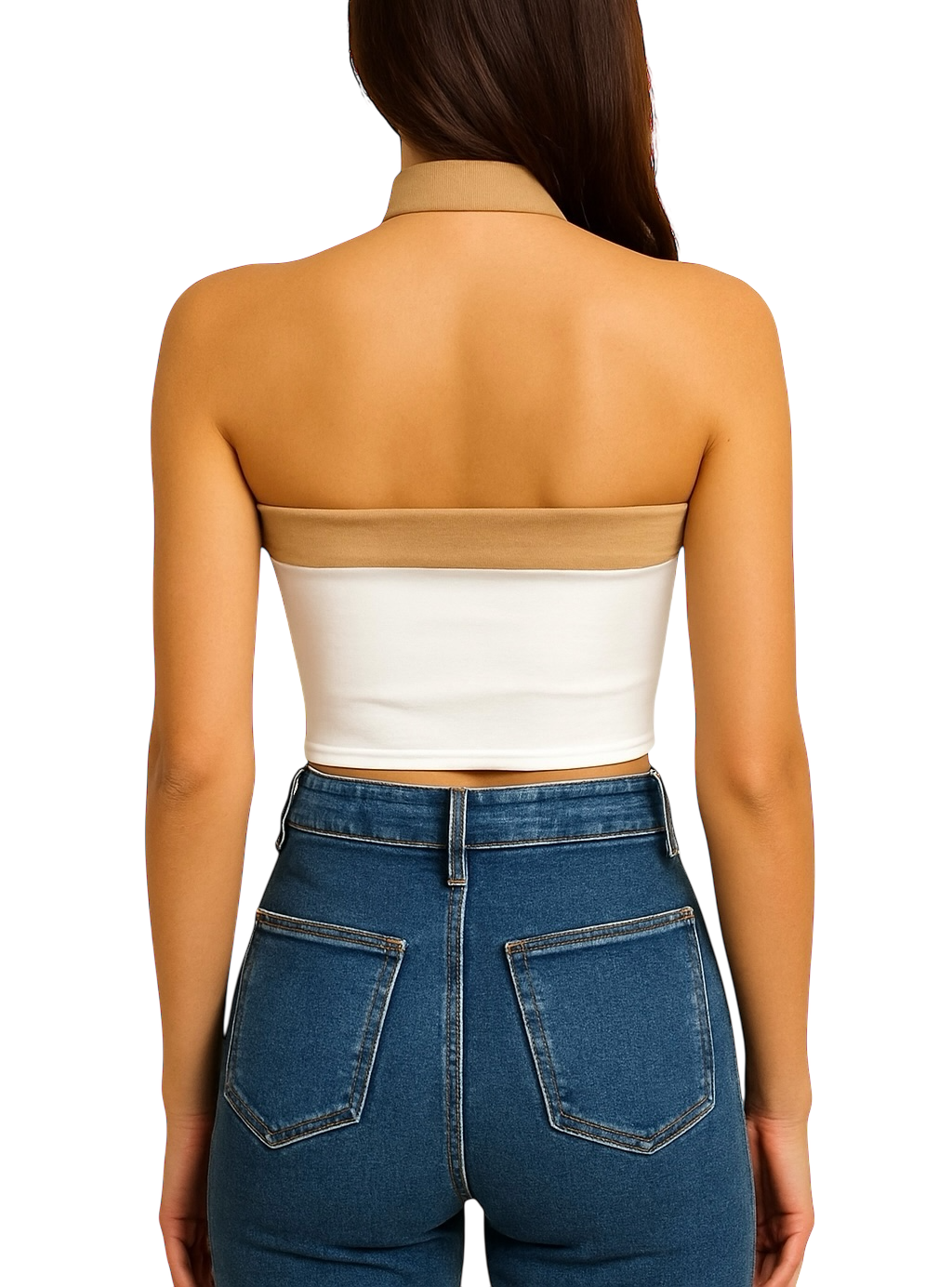 • Cropped tomara que caia com detalhe em faixa contrastante que valoriza o colo