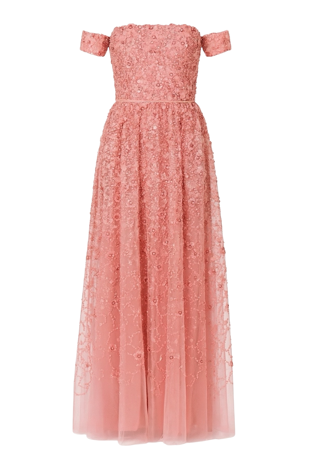 Corpo e saia totalmente trabalhados em renda floral com aplicações e bordados em relevo, trazendo textura rica e aparência luxuosa