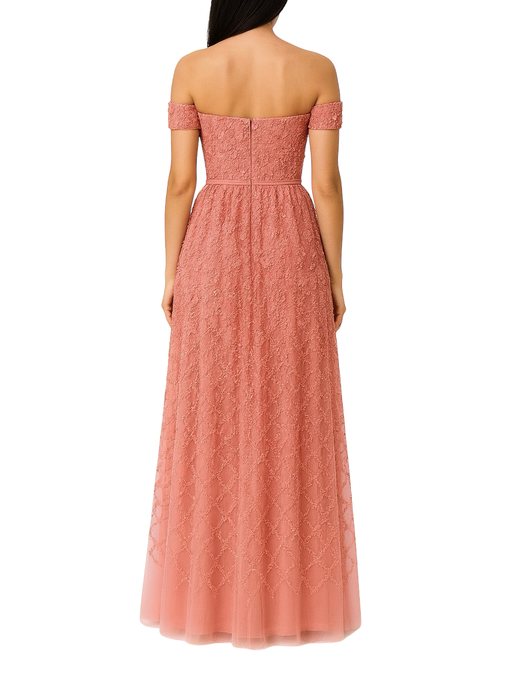 Decote ombro a ombro estruturado, com mangas caídas em renda bordada, valorizando o colo de forma feminina e delicada