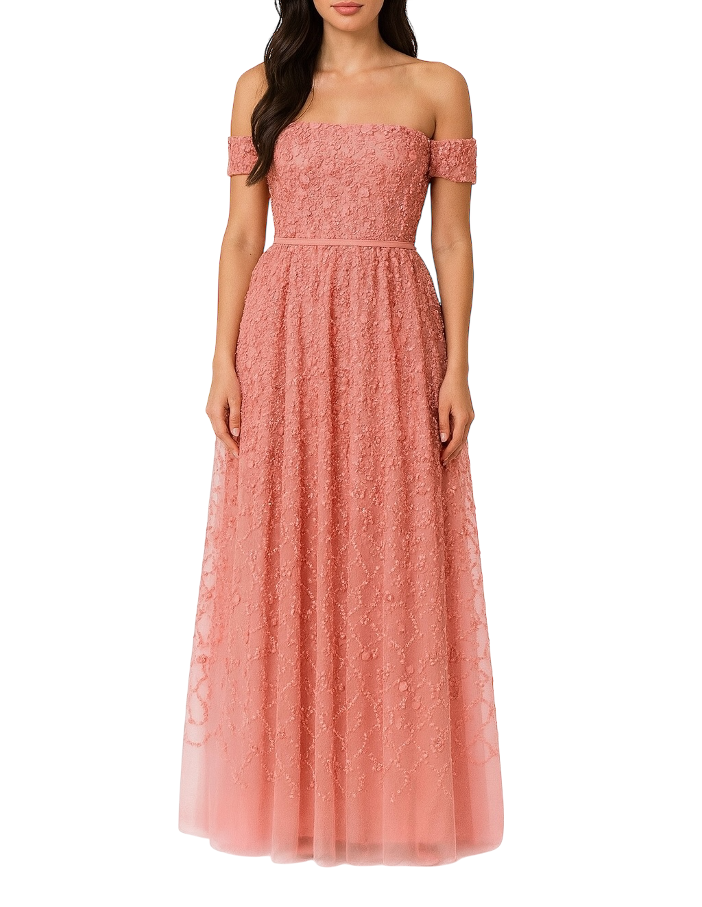 Saia longa com caimento fluido em camadas de tule bordado, garantindo movimento suave e elegante ao caminhar