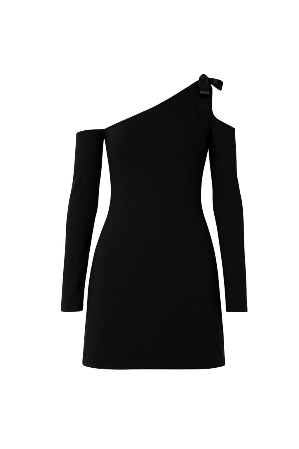 Decote assimétrico um ombro só, com detalhe de laço no ombro, trazendo charme e sofisticação ao design