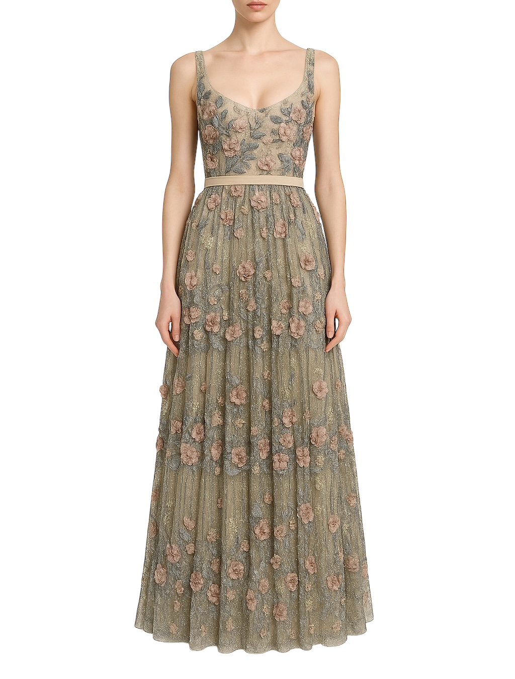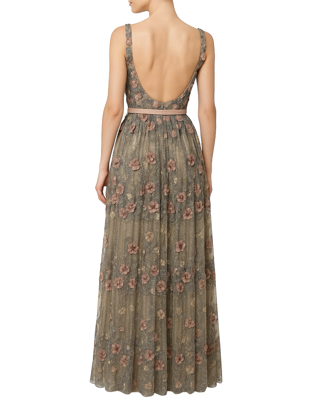 Bordados em fio metálico e aplicações florais em tons rosados e acinzentados, criando um efeito luxuoso e romântico