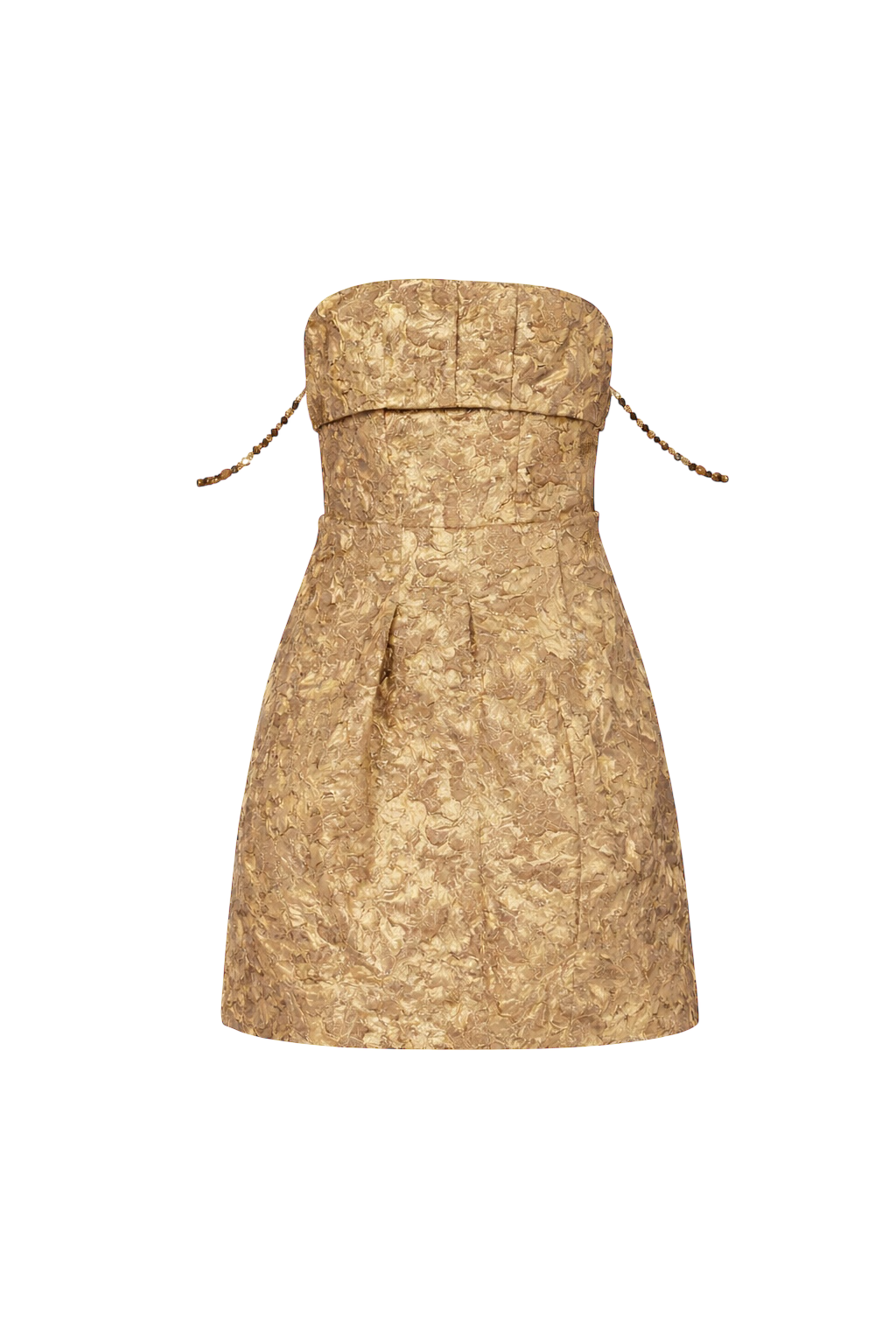 Correntes delicadas aplicadas nos braços, com elos planos e acabamento dourado fosco, agregando um toque exclusivo ao design