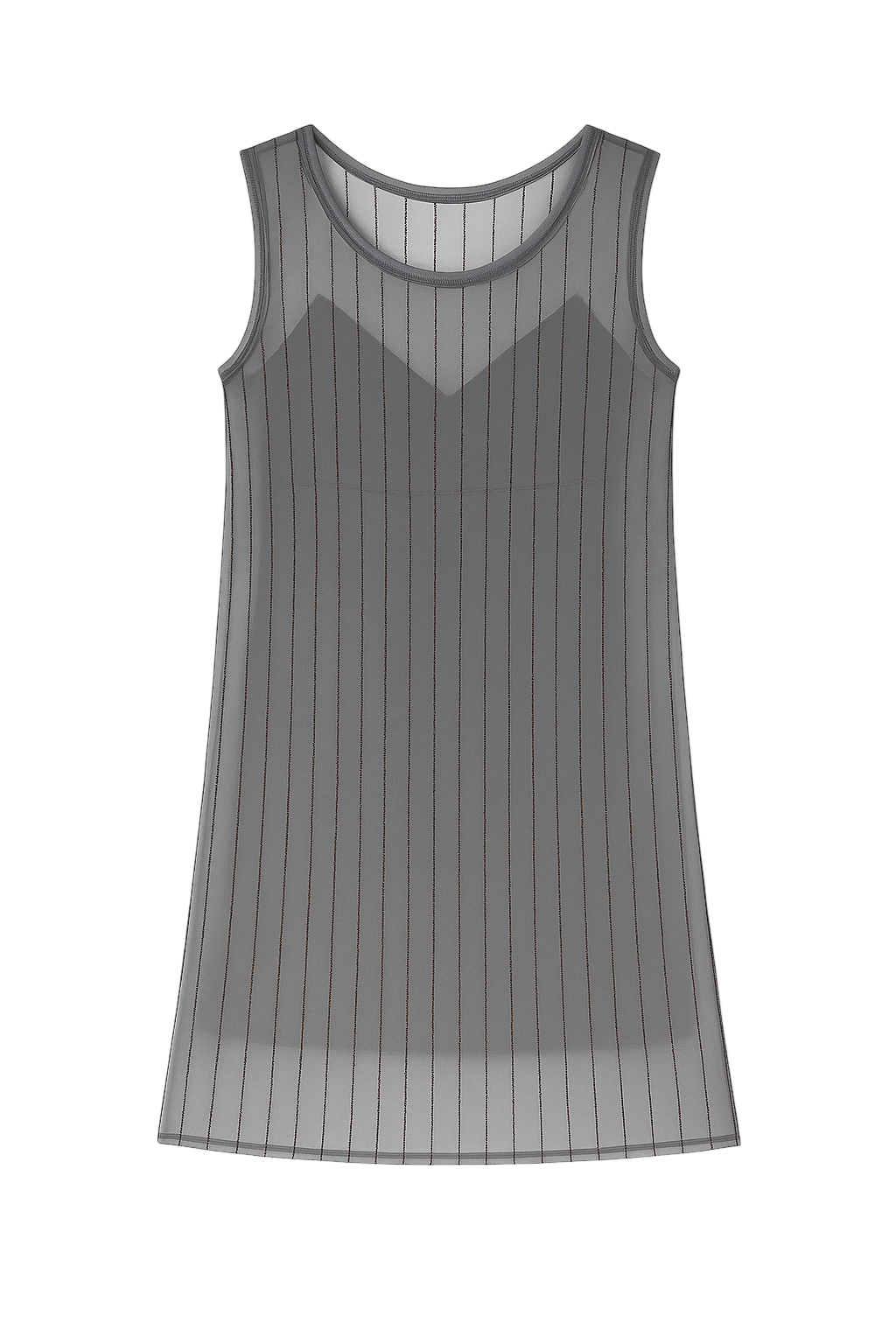 • Tecido translúcido em tule cinza com listras verticais bordadas em fios de correntes prateadas, criando um efeito de brilho delicado e sofisticado