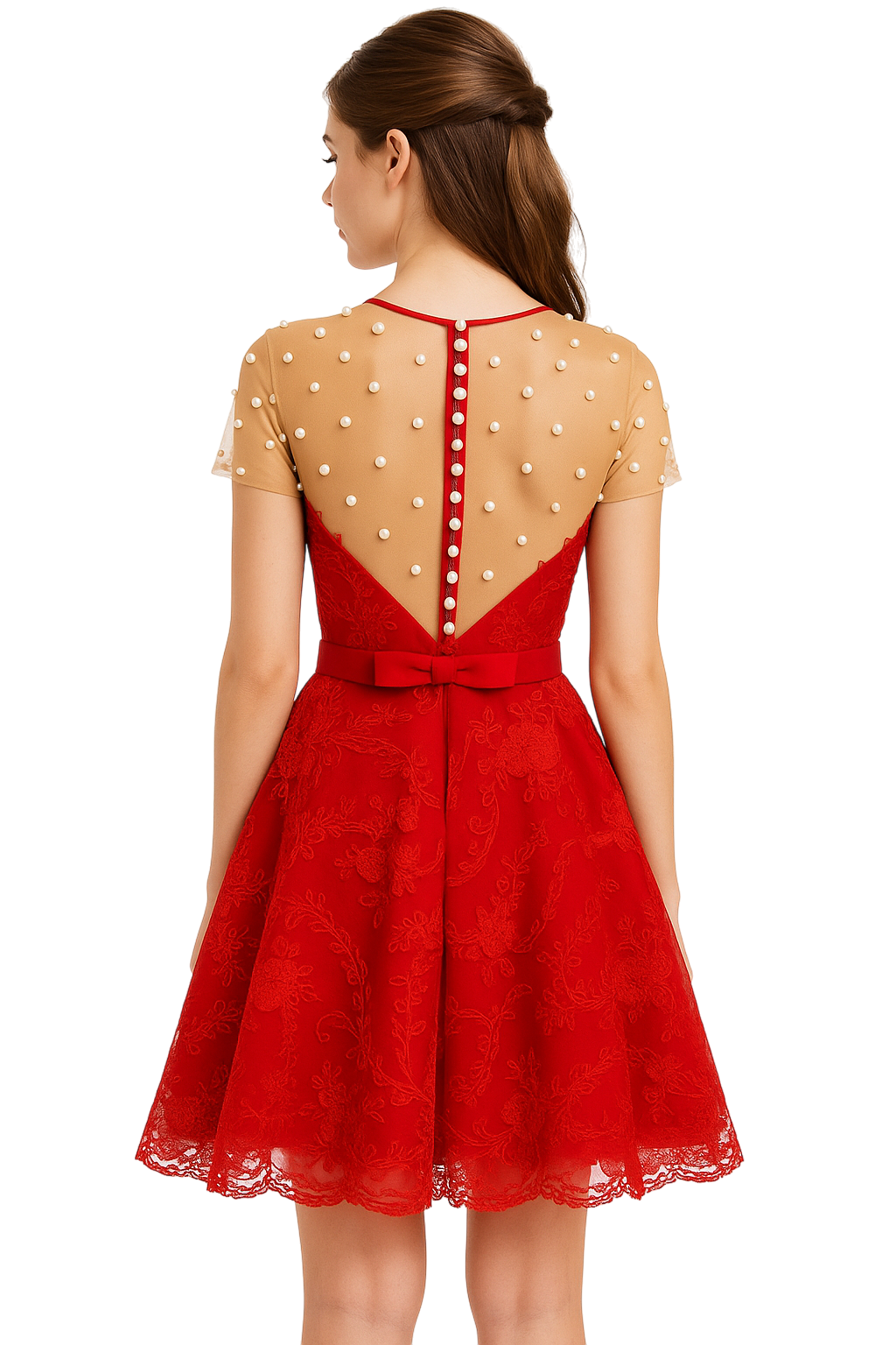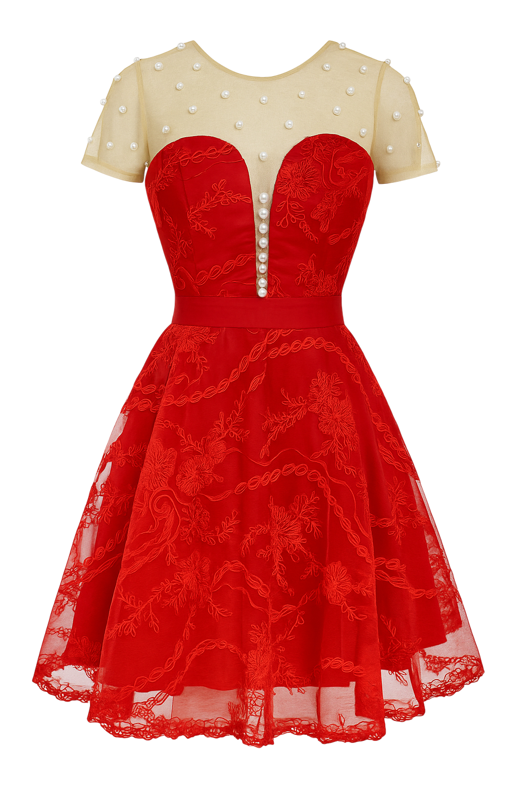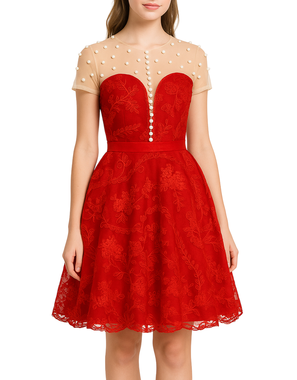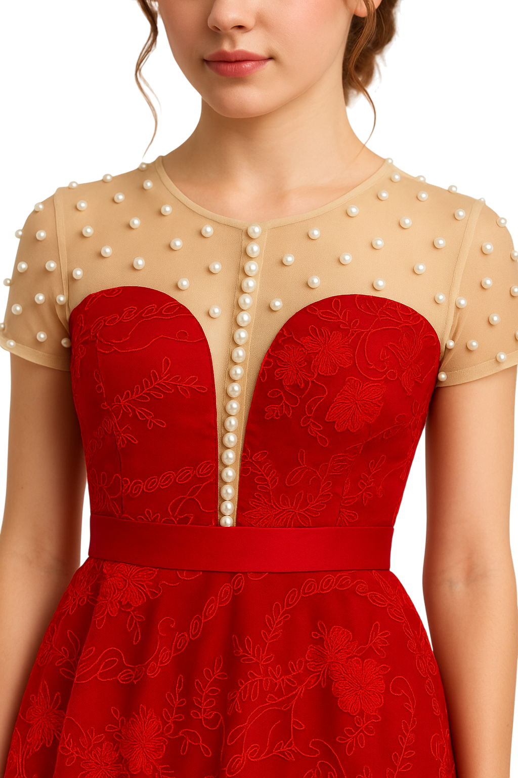 • Decote coração com tule transparente e pérolas aplicadas.